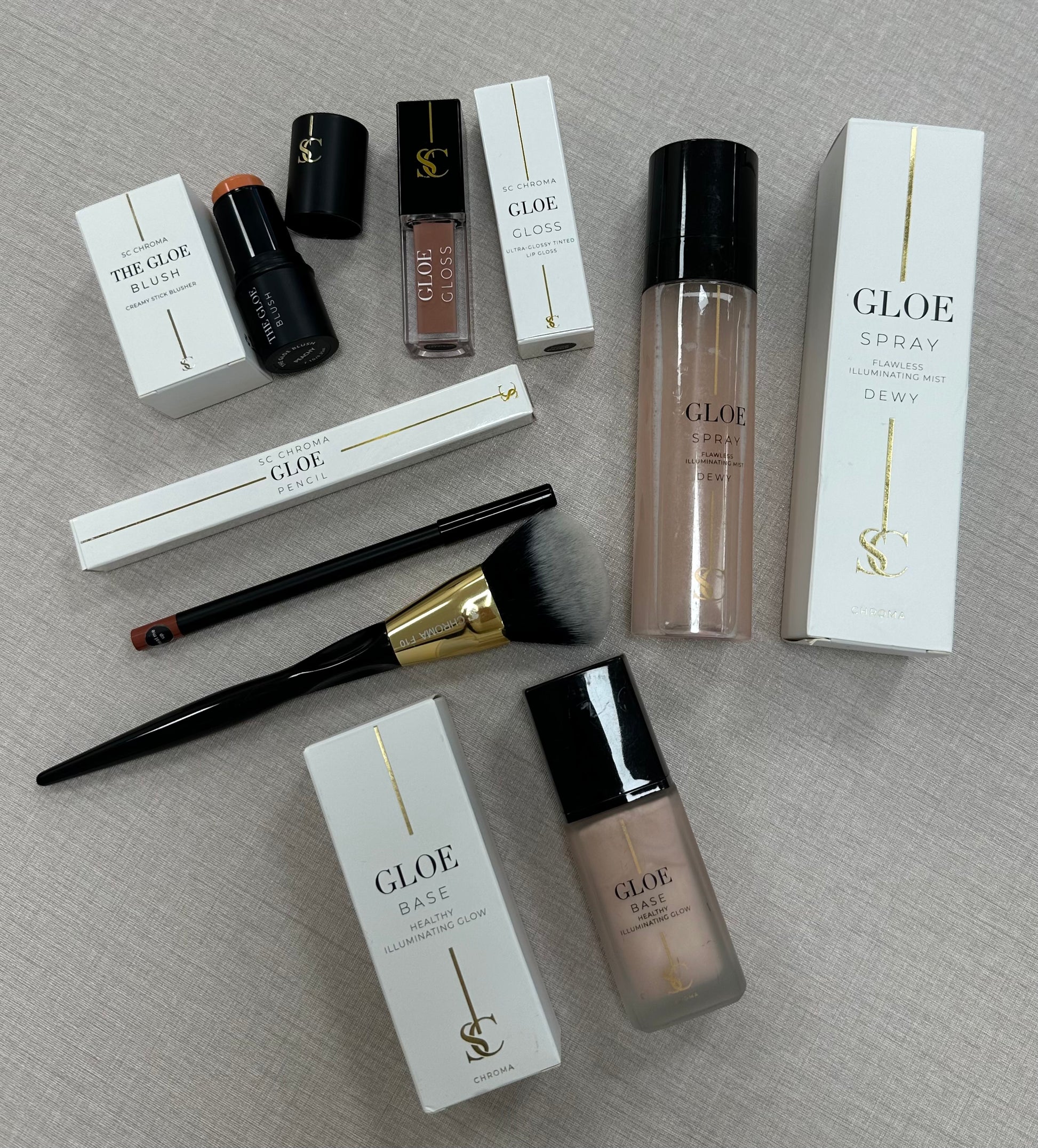 Gloe Illuminating Base, Dewy Gloe Spray, Gloe Blush, Gloe Lip Liner, Gloe Lip Gloss, F10 Foundation Brush