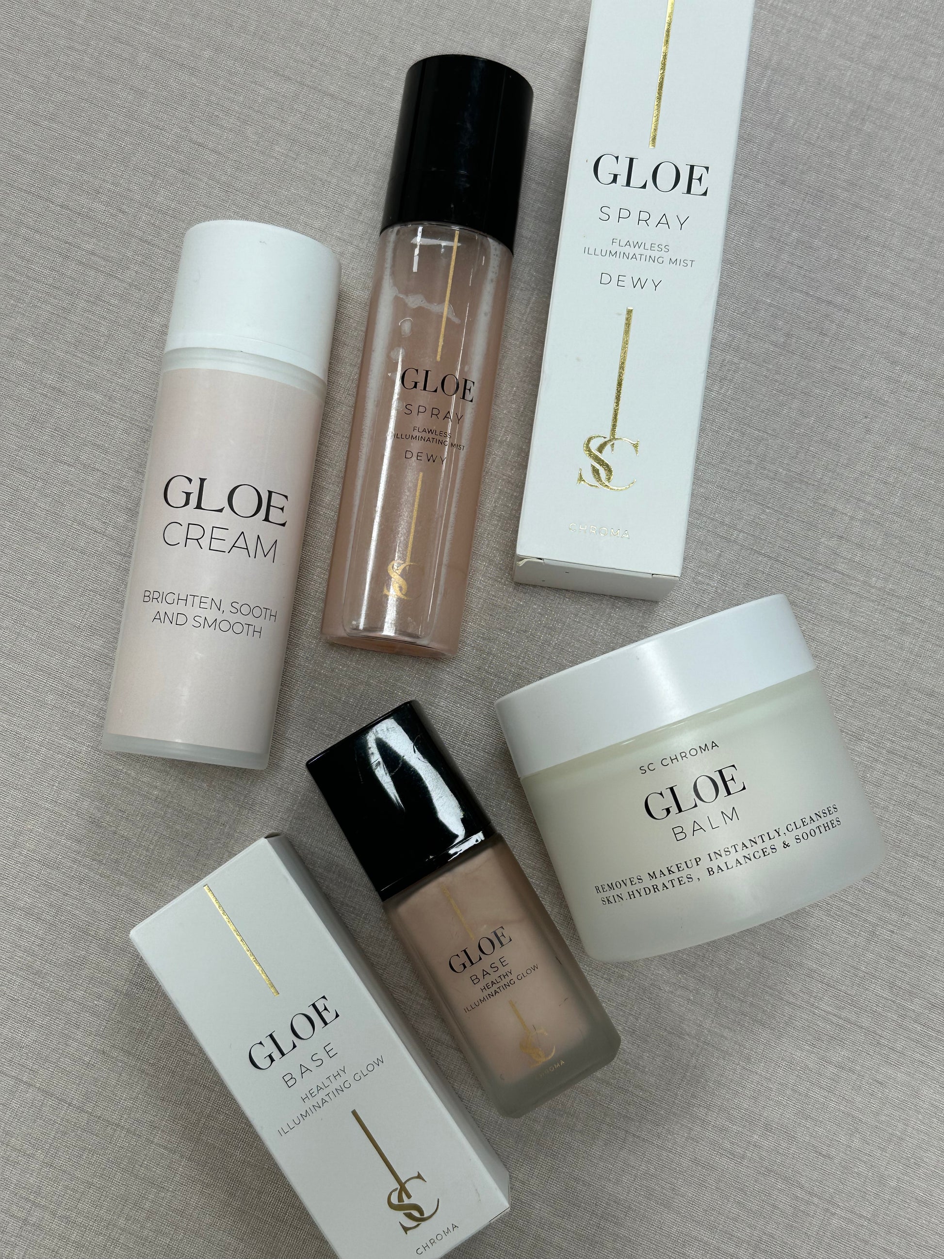 Gloe Balm, Gloe Cream, Gloe Illuminating Base, Dewy Gloe spray